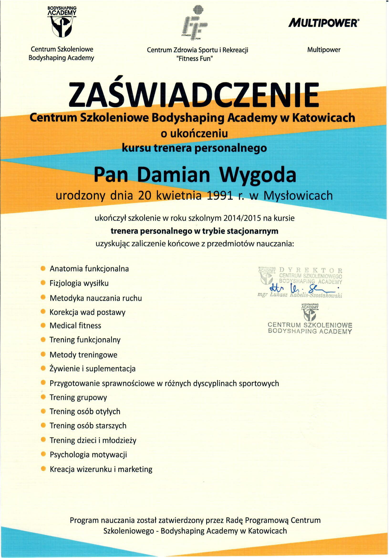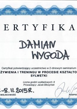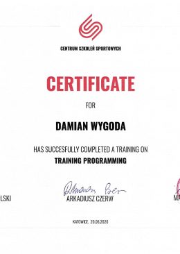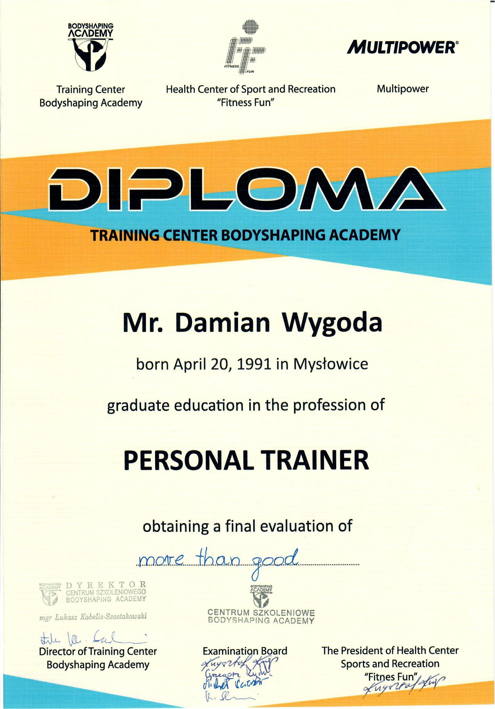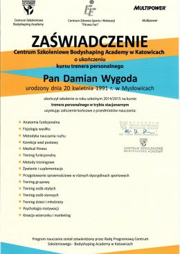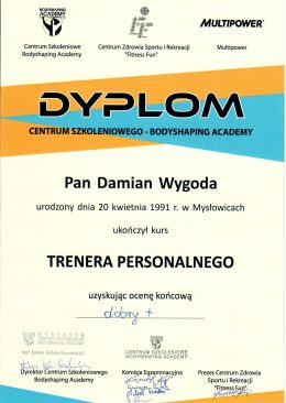 Cześć! Nazywam się Damian Wygoda. Jestem dyplomowanym trenerem personalnym i absolwentem kierunku Fizjoterapii na Akademii Wychowania Fizycznego im. Jerzego Kukuczki w Katowicach.